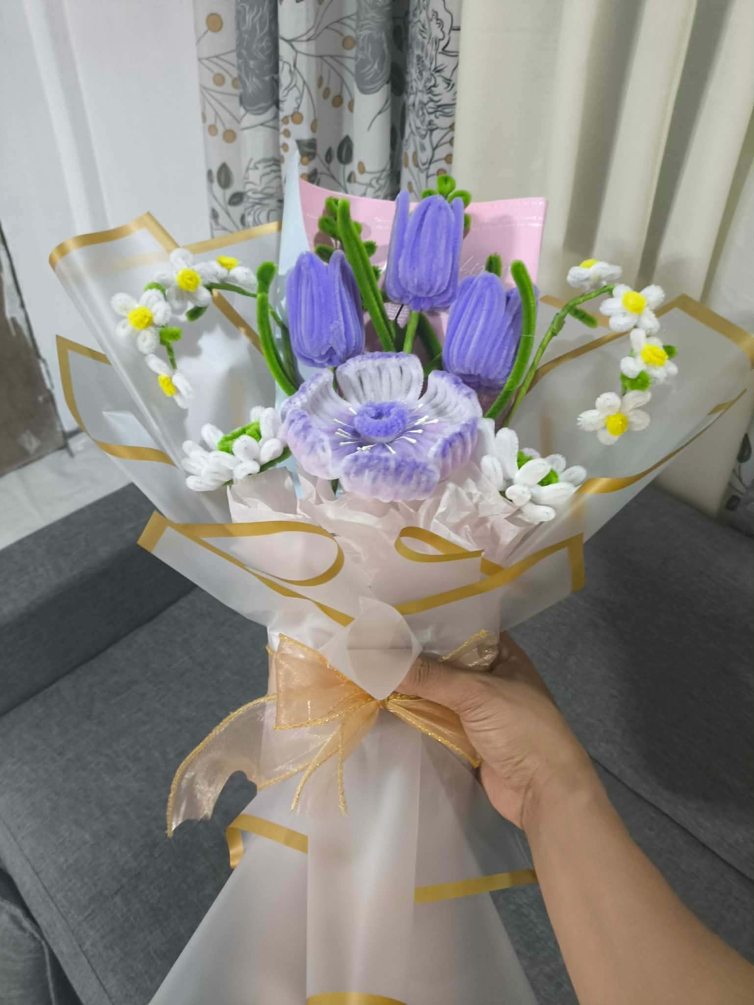 This fuzzy wire bouquet is a cute and long lasting gift. It is made from soft fuzzy wires and designed with bright colors. Perfect for graduation, anniversary, monthsary, birthdays, and other special events. It will not wither, so it can be kept as a remembrance for a long time.